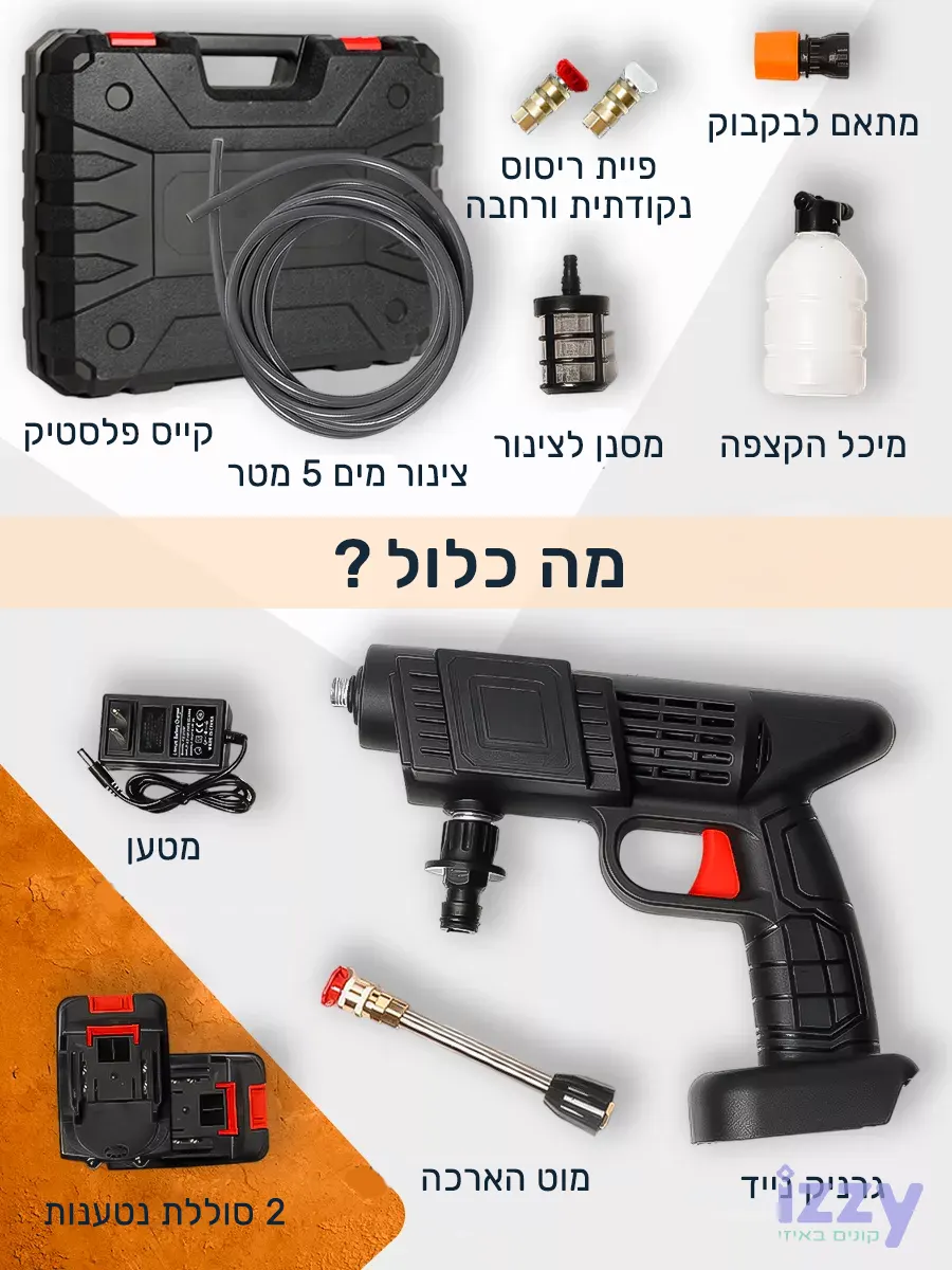 המכשיר הזה הוא גרניק נטען עם מנוע עוצמתי בהספק של 1000W, המספק תפוקת מים חזקה ומהירה לכל משימת ניקוי. בזכות היותו מכונת שטיפה ניידת, תוכלו לקחת אותו לכל מקום – לניקוי בחניה, בגינה, או אפילו בטיולים בשטח