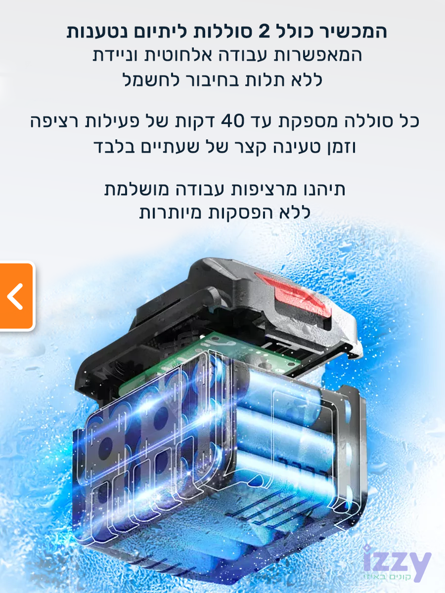 המכשיר מגיע עם שתי סוללות ליתיום נטענות המספקות עד 40 דקות של פעילות לאחר טעינה מלאה של שעתיים בלבד. כך תוכלו להשתמש בו לשטיפת הרכב או לכל משימת ניקוי אחרת מבלי לדאוג להטענה תכופה.רב שימושי