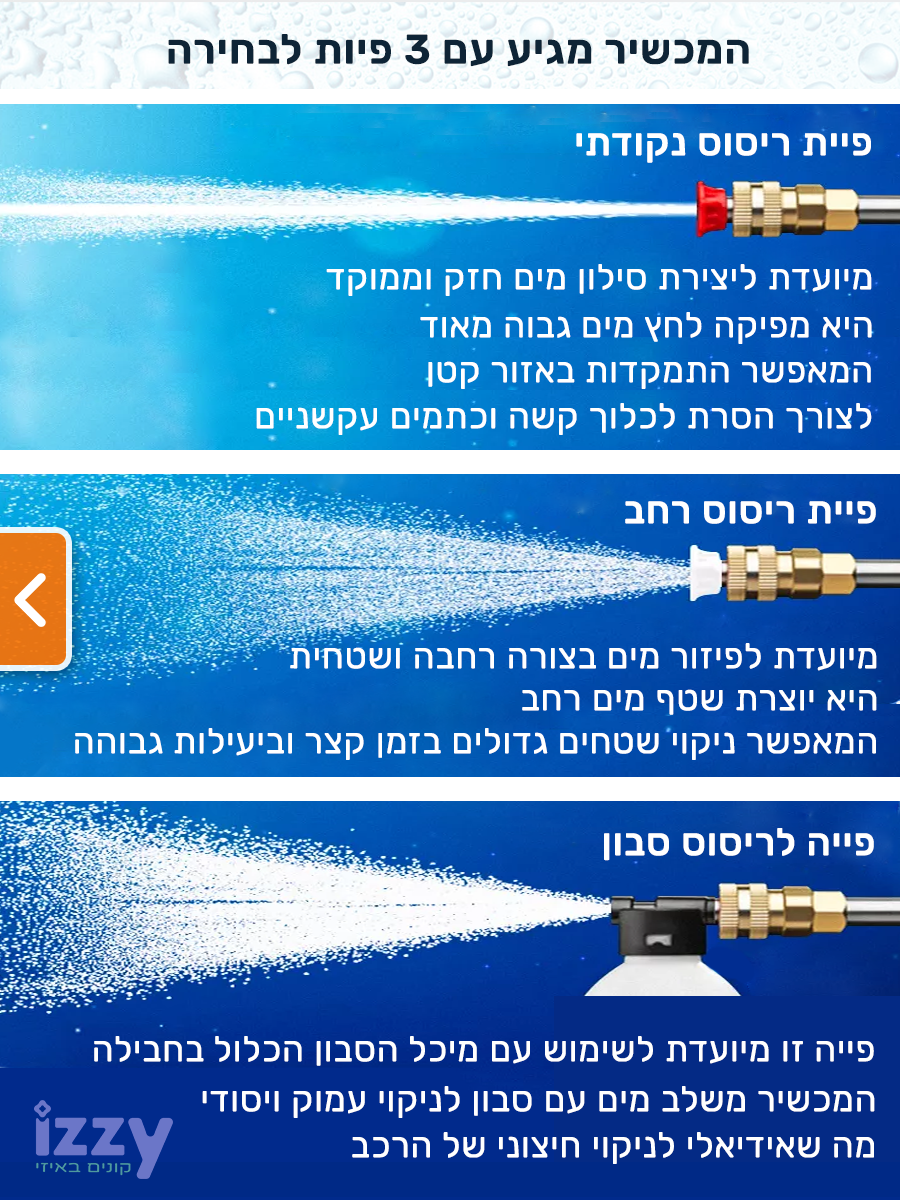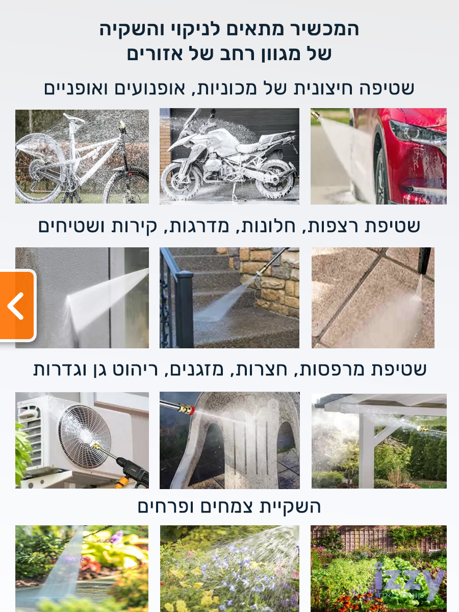 בנוסף לניקוי רכב, מכונת השטיפה בלחץ נטענת זו מושלמת גם לניקוי חלונות, שבילים, גדרות, ריהוט גן, מרפסות, אופניים, טרקטורונים ואפילו השקיית צמחים וגינות. כל זה מתאפשר בזכות הפיות המגוונות הכלולות בערכה: פיית ריסוס רחב, פיית ריסוס נקודתי ופייה לריסוס סבון.תכונות מיוחדות
